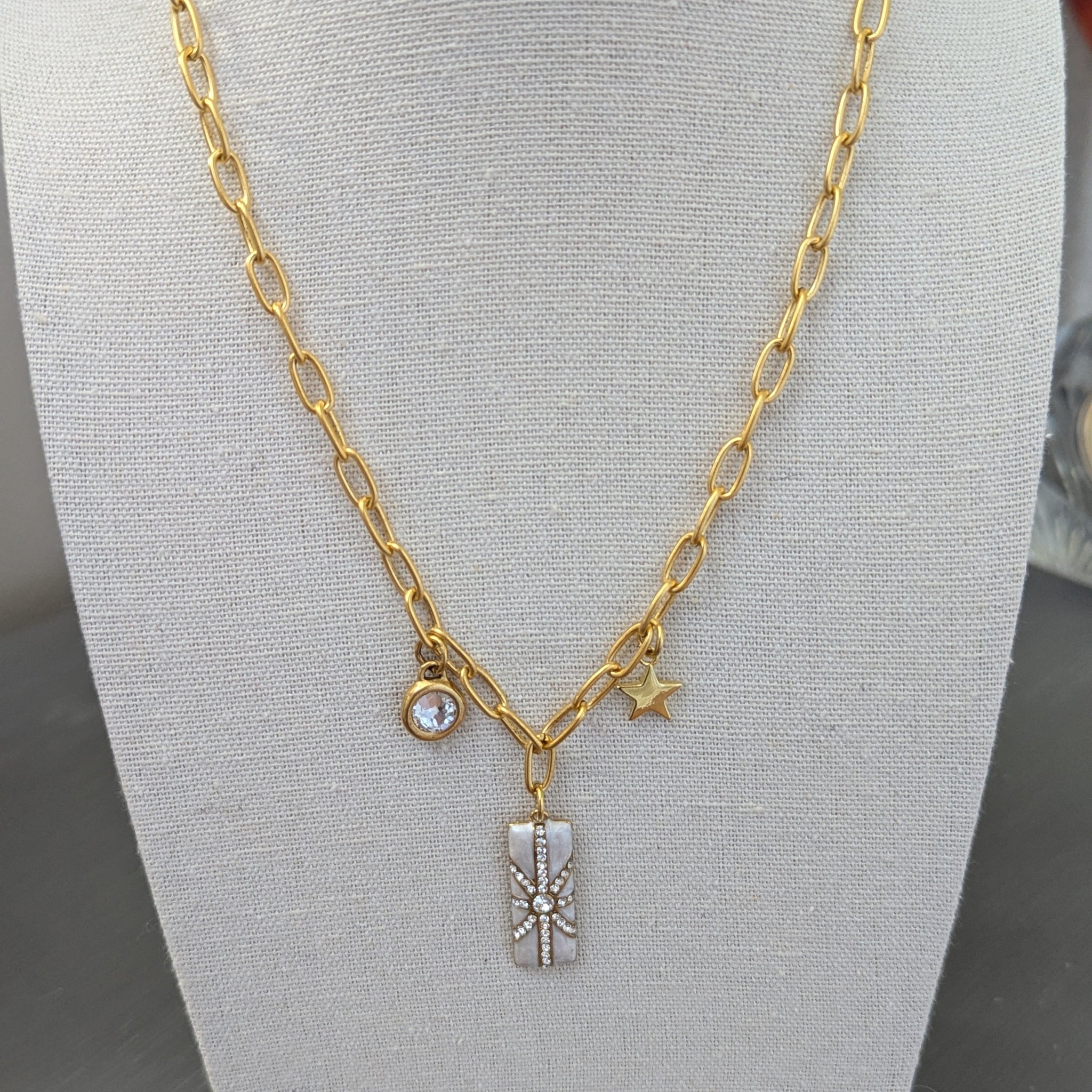 Rectangle black or pearly white enamel star, gold star and crystal circle charms on antique gold chain.