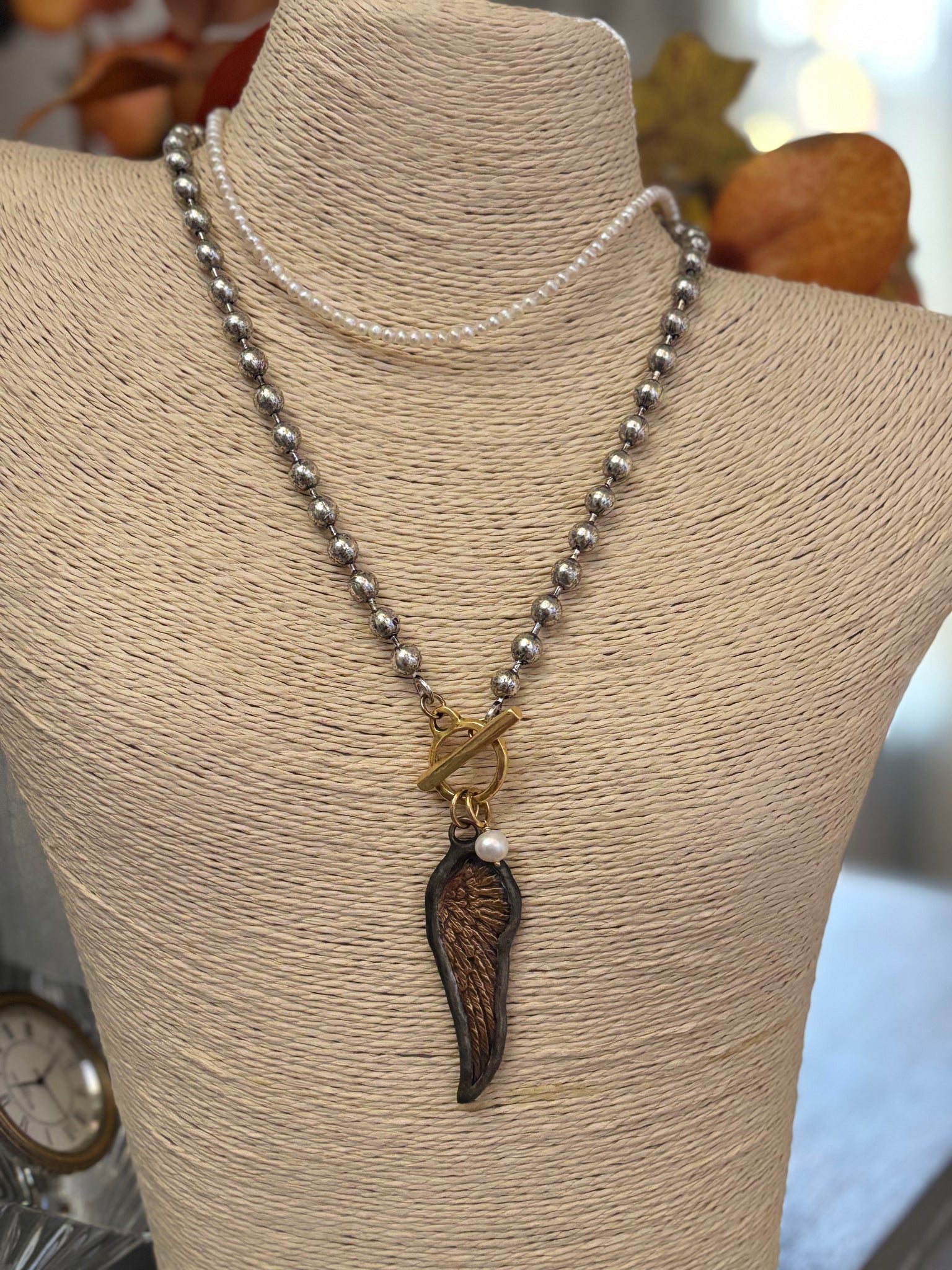Soldered wing with pearl charm on silver ball chain with toggle.