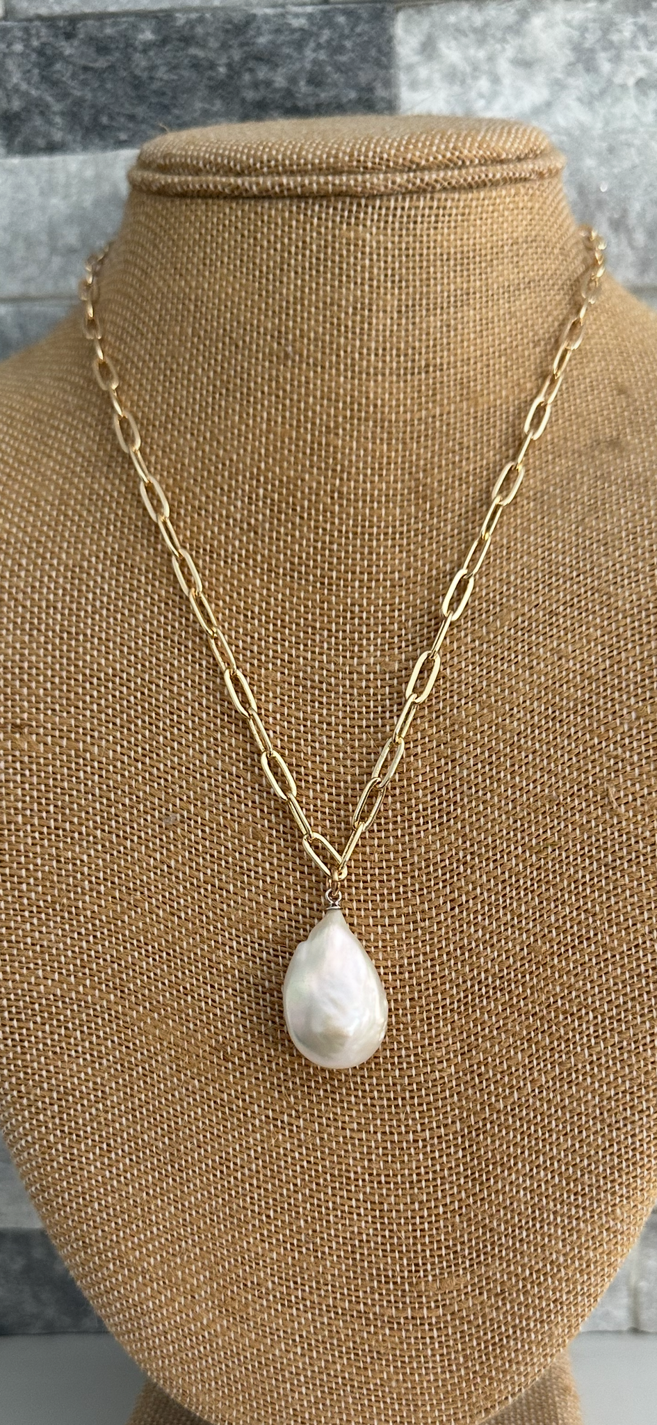 Beautiful timeless statement necklace.  Baroque pearl pendant on 14k gold filled paperclip chain.